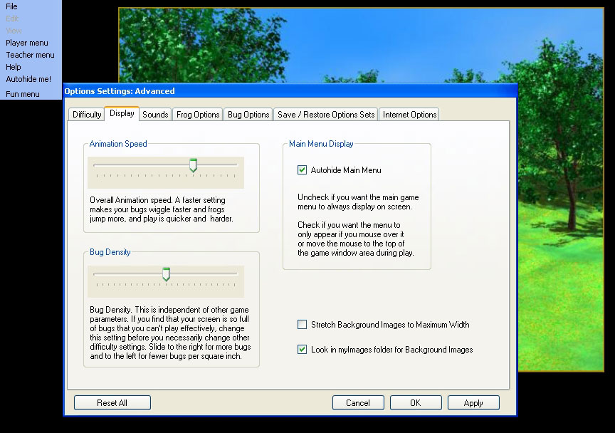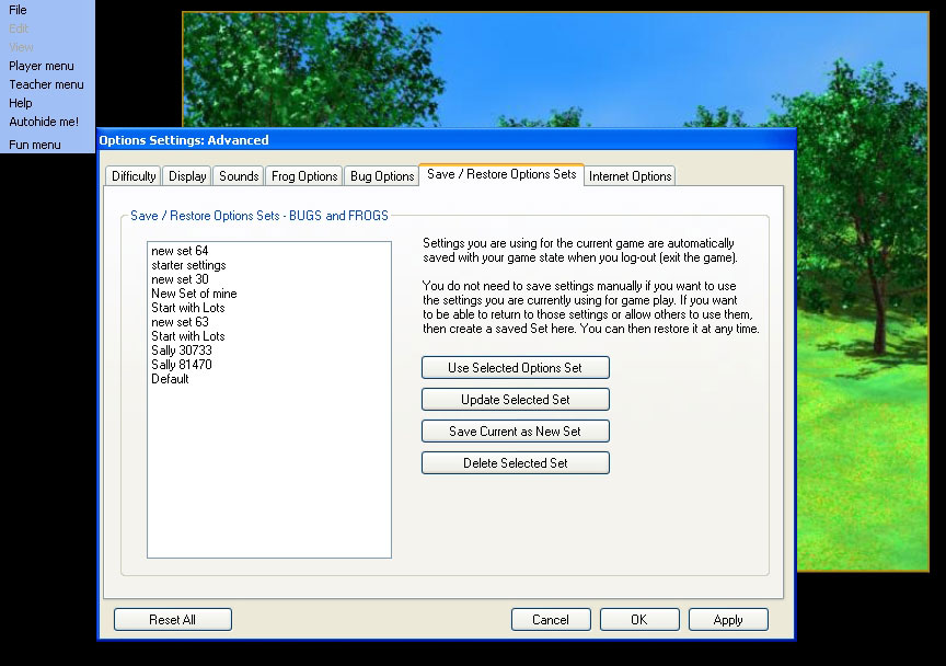 Advanced Options Dialog Difficulty | Display | Sounds | Frog Options | Bug Options | Save / Restore Options Sets | Internet Options | Image Gallery |