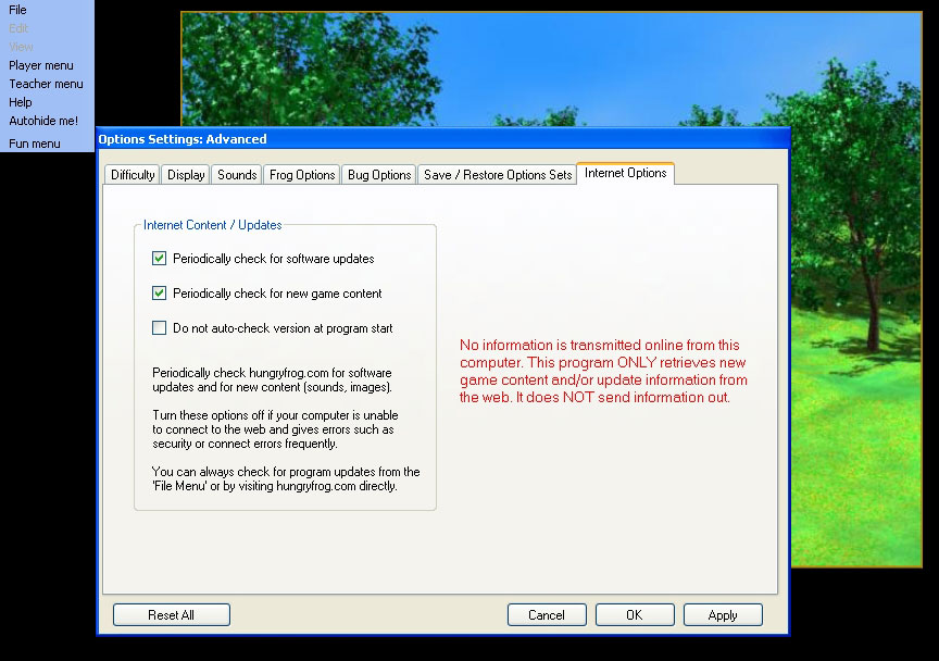 If you have an internet connection it is highly recommended that you leave these options at their default settings. It will not slow down game play, and it is the easiest way to know that your software is always the most current. If new additions are made to the built-in Latin dictionary, or new images for backgrounds are available, you will get them fastest through the automated update process. There is an enforced maximum download time at the start of the program for content checks, so new content updates should not delay game start too much as in some other program. The Hungry Frog Latin language software program checks every few weeks for new content at startup if 'Periodically check for new game content' is checked and for new program upgrades if the 'Periodically check for software updates' option is checked. The game will check about a few times a year to look for new software version availablity. You can turn off program auto-checking at startup with the 'Do not auto-check version at program start' option turned on.