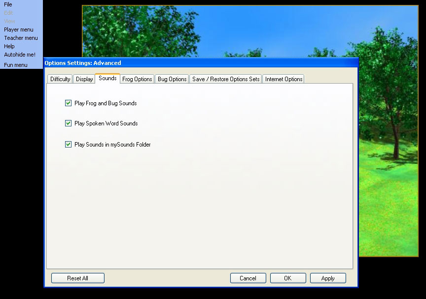 The Play Spoken Word Sounds checkbox determines if the game speaks the Latin word frog names aloud. This is STRONGLY suggested to be left on.