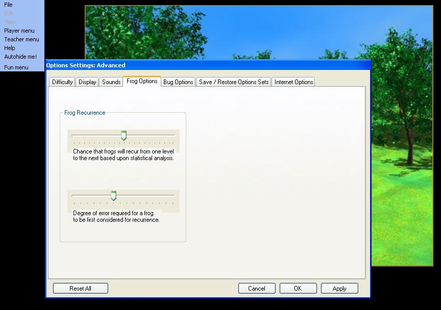 The Frog Options tabbed page relates to game frog settings which are game settings un-related to bug spawning. Both relate to how much statistical analysis emphasis is placed upon Latin words missed or correctly matched according to the Latin dictionary and repeating problem frogs vs. randomly selecting new frogs from the current Latin lesson at each new level.
