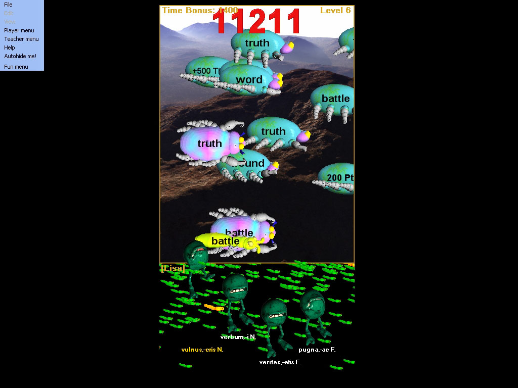 The Hungry Frog Latin language software game screen with the default setting of 'Autohide me!' OFF and using full screen mode: