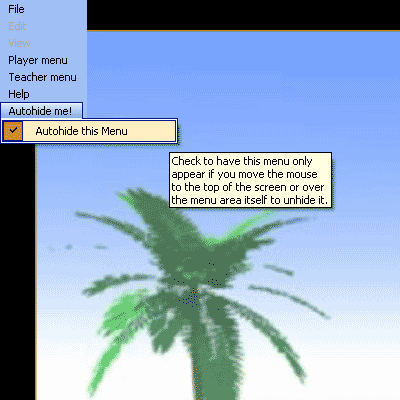 In the Hungry Frog Latin language software program and the other Hungry Frog software version 6.0 programs such as Hungry Frog Homeric Greek, you can turn on or off the 'Autohide me!' feature simply by selecting the 'Autohide me!' menu item. Each time you select the menu item, you toggle the check box status from Autohide me! ON to Autohide me! OFF or visa versa. The orange colored check box to the left of the text menu listing indicates the current status. The Autohide me! feature functions whether you are playing in full screen mode or playing in windowed mode, but the Hungry Frog Latin language game display looks and feels best if you always leave Autohide me! ON and always play in full screen mode.