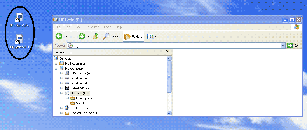 The installer has placed two shortcuts on your desktop. One is to the v4.3 software if you want to run the older software program version. The second is to the new software version. In the screen capture the program installed is Hungry Frog Latin. Depending upon the exact program version and learning topic, your shortcut names may be slightly different. You can run the programs by double clicking on these shortcuts, or you can copy or move them on your computer.