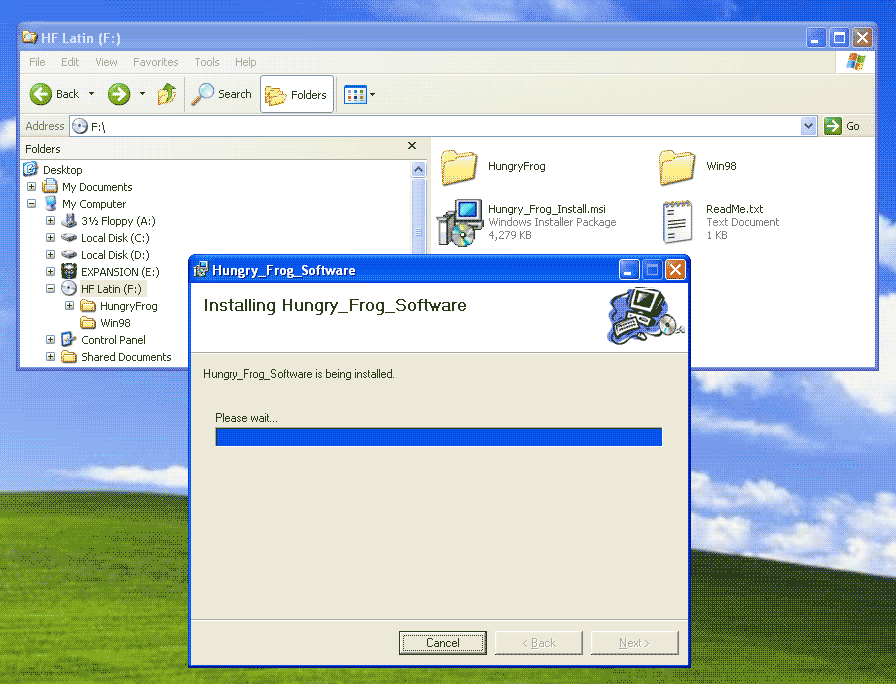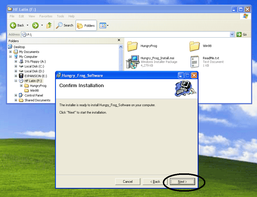 Insert your Hungry Frog Software CD-ROM into the CD-ROM Drive and wait for it to spin up. Navigate the CD-ROM directory with Windows Explorer and find the items shown in the screen capture below.
