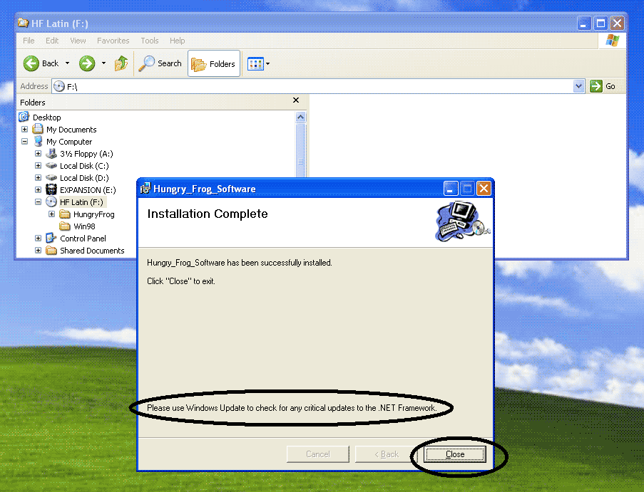 Installation is now complete for the Hungry Frog Software. The newer software uses features of Microsoft .NET framework. The Windows Installer prompts you to use Windows Update to make sure your .NET (and other Windows Operating System Components) is up to date. You should always keep your computer up to date with Microsoft Update as Microsoft provides very important security fixes to their software all the time and you want to be current. Run Windows Update to make sure your computer operating system is up to date. If you do not have Microsoft .NET framework installed on your computer, visit microsoft.com